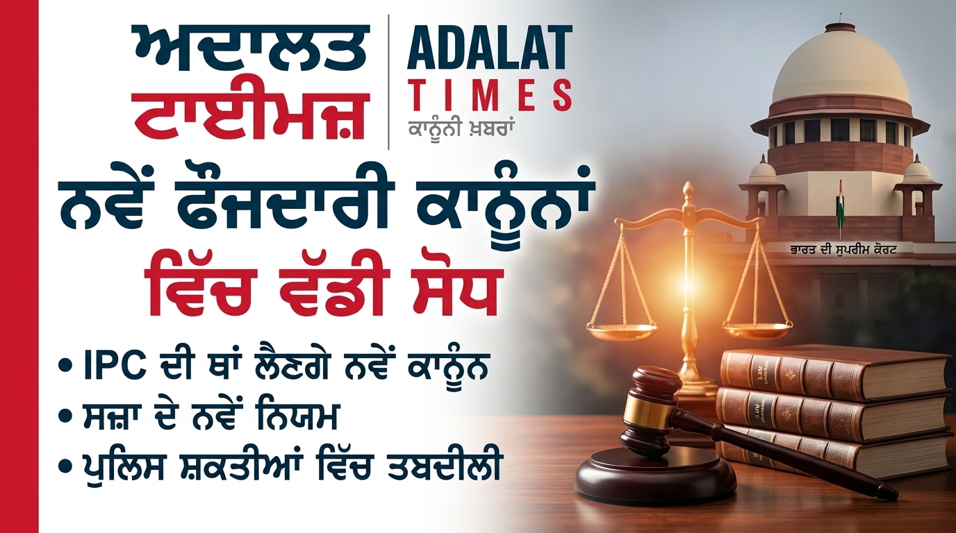 ਅਪਰਾਧ ਤੇ ਕਾਨੂੰਨ ਨਵੇਂ ਫੌਜਦਾਰੀ ਕਾਨੂੰਨ ਸੋਧ ਦਾ ਪੰਜਾਬ ਅਦਾਲਤਾਂ ਵਿੱਚ ਹਜ਼ਾਰਾਂ ਕੇਸਾਂ ‘ਤੇ ਅਸਰ ਅਦਾਲਤਨਾਮਾ ਟੀਮ Apr 16, 2026 0 ਫੌਜਦਾਰੀ ਕਾਨੂੰਨ ਪ੍ਰਕਿਰਿਆ ਵਿੱਚ ਹਾਲੀਆ ਸੋਧ ਨੇ ਪੰਜਾਬ ਦੀਆਂ ਅਦਾਲਤਾਂ ਵਿੱਚ ਹਜ਼ਾਰਾਂ ਪੈਂਡਿੰਗ ਕੇਸਾਂ ਨੂੰ ਪ੍ਰਭਾਵਿਤ ਕਰਨਾ ਸ਼ੁਰੂ ਕਰ ਦਿੱਤਾ… Read More