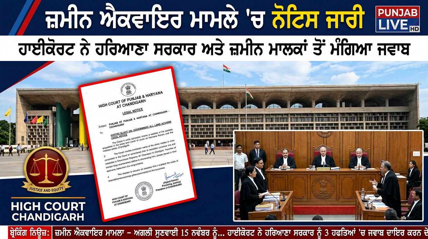 ਹਾਈ ਕੋਰਟ ਪੰਜਾਬ ਅਤੇ ਹਰਿਆਣਾ ਹਾਈ ਕੋਰਟ ਨੇ ਜ਼ਮੀਨ ਐਕੁਜ਼ੀਸ਼ਨ ਕੇਸ ਵਿੱਚ ਨੋਟਿਸ ਜਾਰੀ ਕੀਤਾ ਅਦਾਲਤਨਾਮਾ ਟੀਮ Apr 16, 2026 0