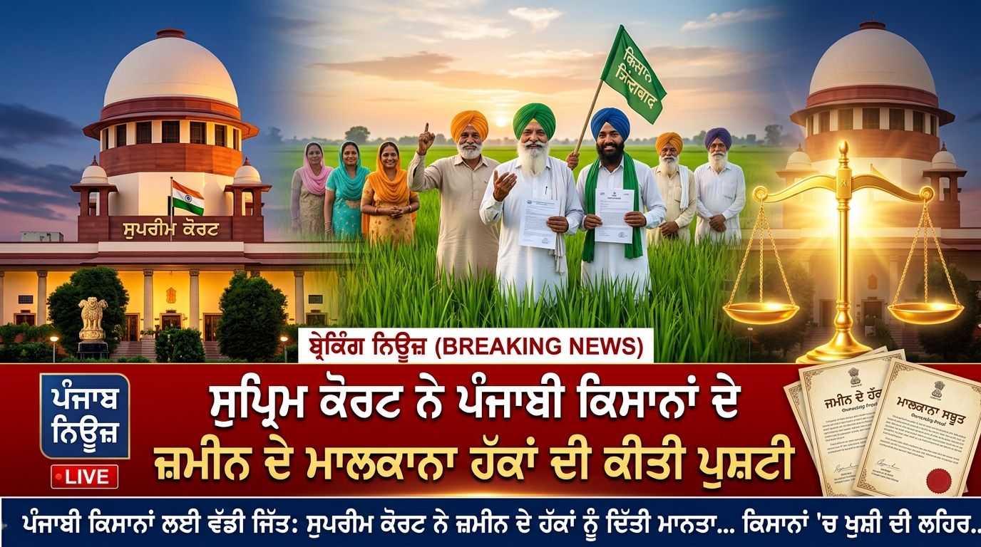 ਸੁਪਰੀਮ ਕੋਰਟ ਸੁਪਰੀਮ ਕੋਰਟ ਨੇ ਪੰਜਾਬ ਦੇ ਕਿਸਾਨਾਂ ਦੇ ਜ਼ਮੀਨੀ ਅਧਿਕਾਰਾਂ ਦੀ ਕੀਤੀ ਪੁਸ਼ਟੀ ਅਦਾਲਤਨਾਮਾ ਟੀਮ Apr 16, 2026 0 ਭਾਰਤ ਦੀ ਸੁਪਰੀਮ ਕੋਰਟ ਨੇ ਪੰਜਾਬ ਦੇ ਕਿਸਾਨਾਂ ਦੇ ਜਾਇਦਾਦ ਅਧਿਕਾਰਾਂ ਨੂੰ ਬਰਕਰਾਰ ਰੱਖਦੇ ਹੋਏ ਇੱਕ ਇਤਿਹਾਸਕ ਫੈਸਲਾ ਸੁਣਾਇਆ ਹੈ।… Read More
